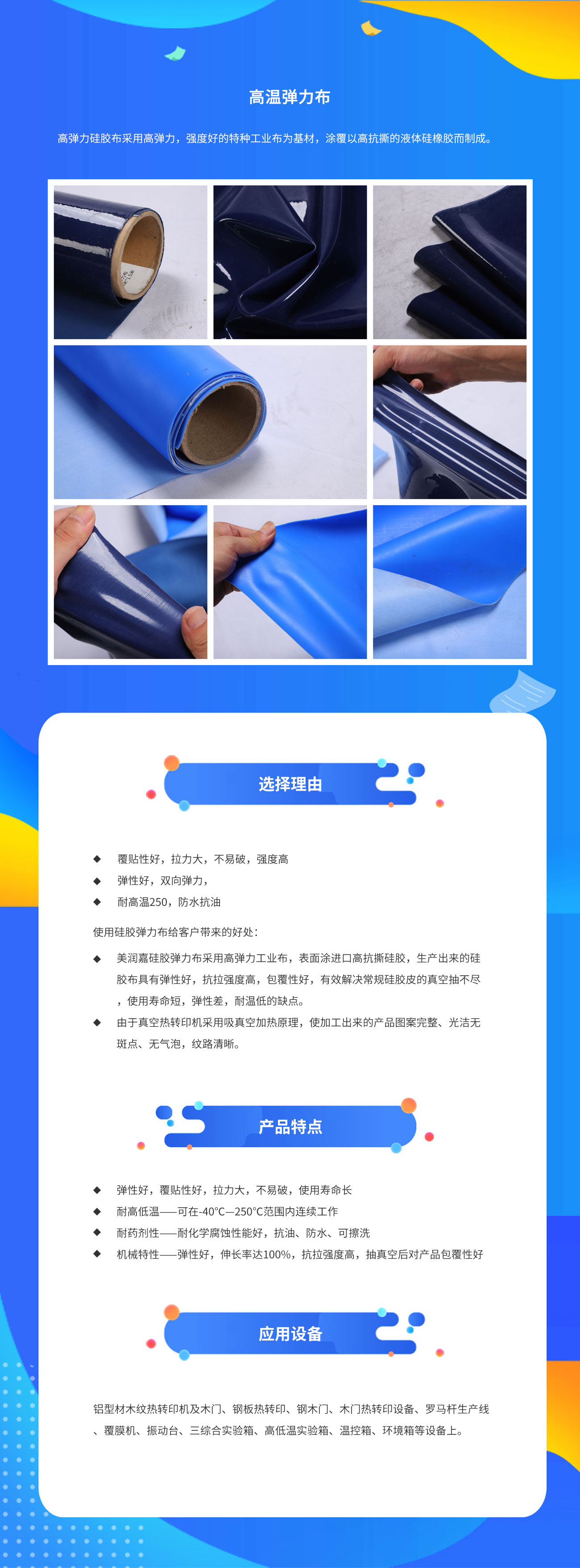 高弹力硅胶布采用高弹力,强度好的特种工业布为基材,涂覆以高抗撕的液体硅橡胶而制成。