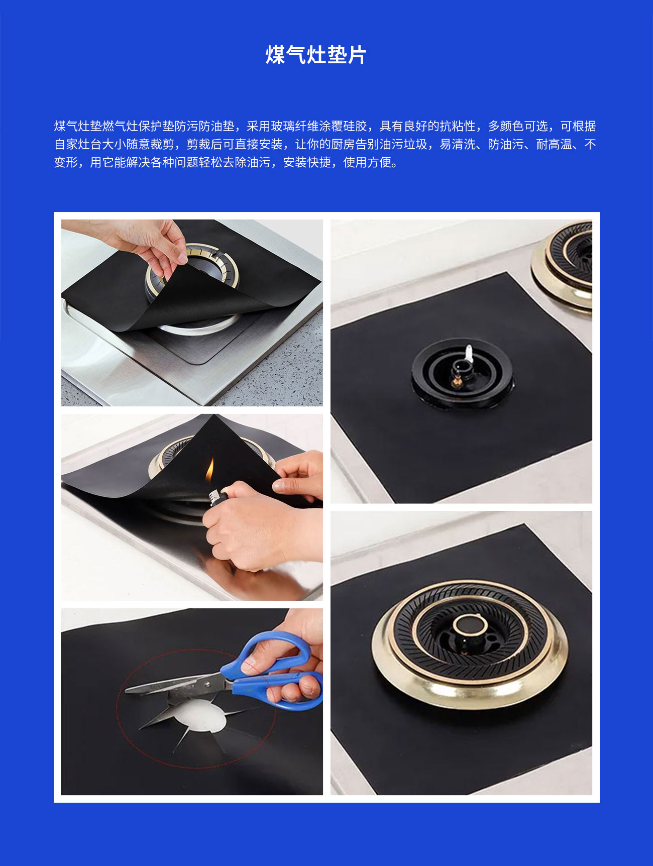 煤气灶垫燃气灶保护垫防污防油垫,采用玻璃纤维涂覆硅胶,具有良好的抗粘性,多颜色可选,可根据自家灶台大小随意裁剪,剪裁后可直接安装。