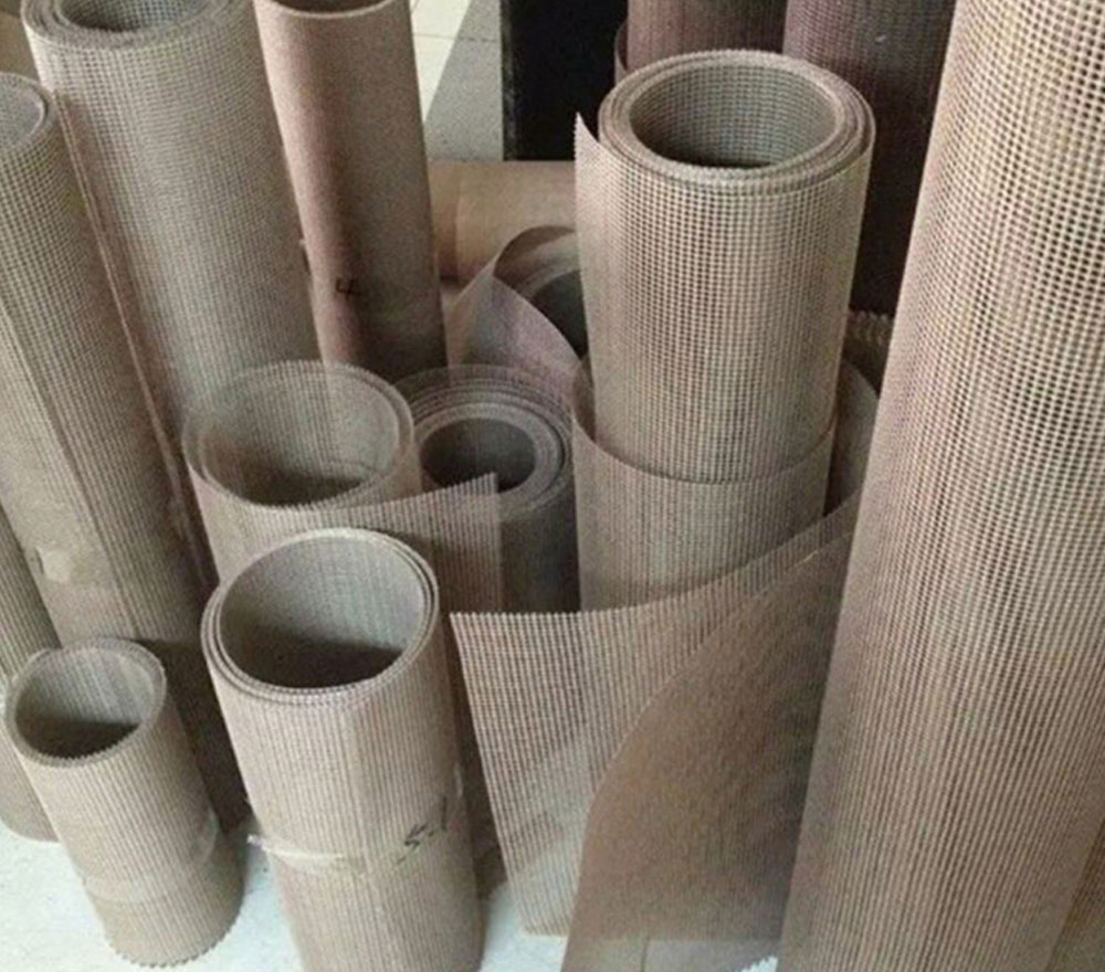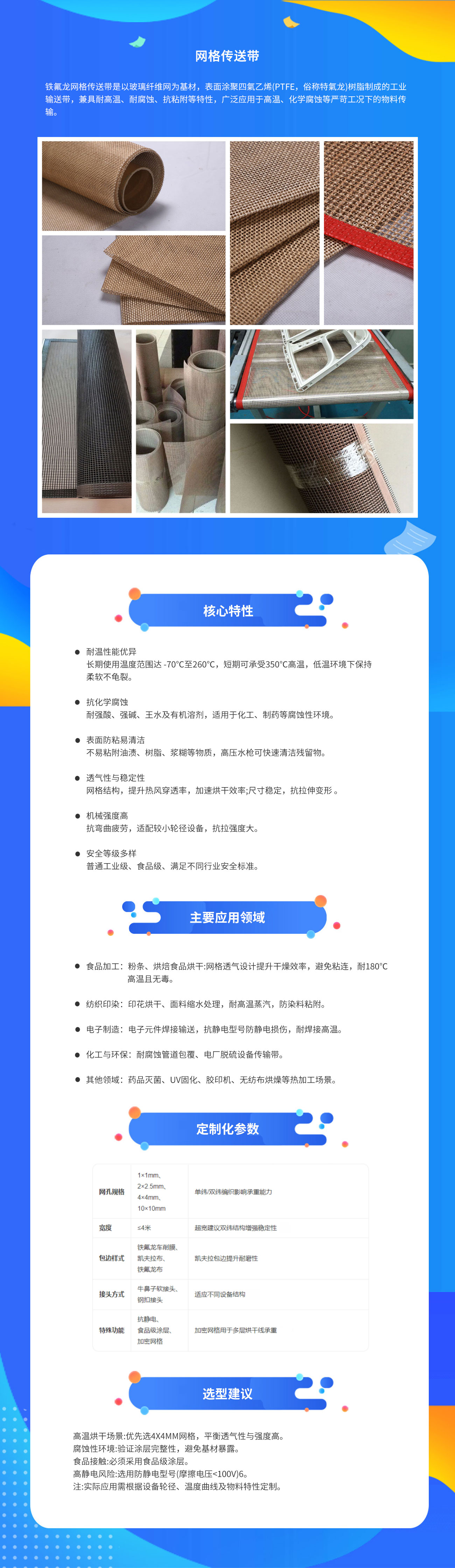 网孔结构(孔径1x1mm至10x10mm)用于纺织印染、烘干机、印花导带加速水分蒸发,耐染料化学腐蚀,紫外线固化(UV光固机)、高周波烘干设备中的耐高温输送。