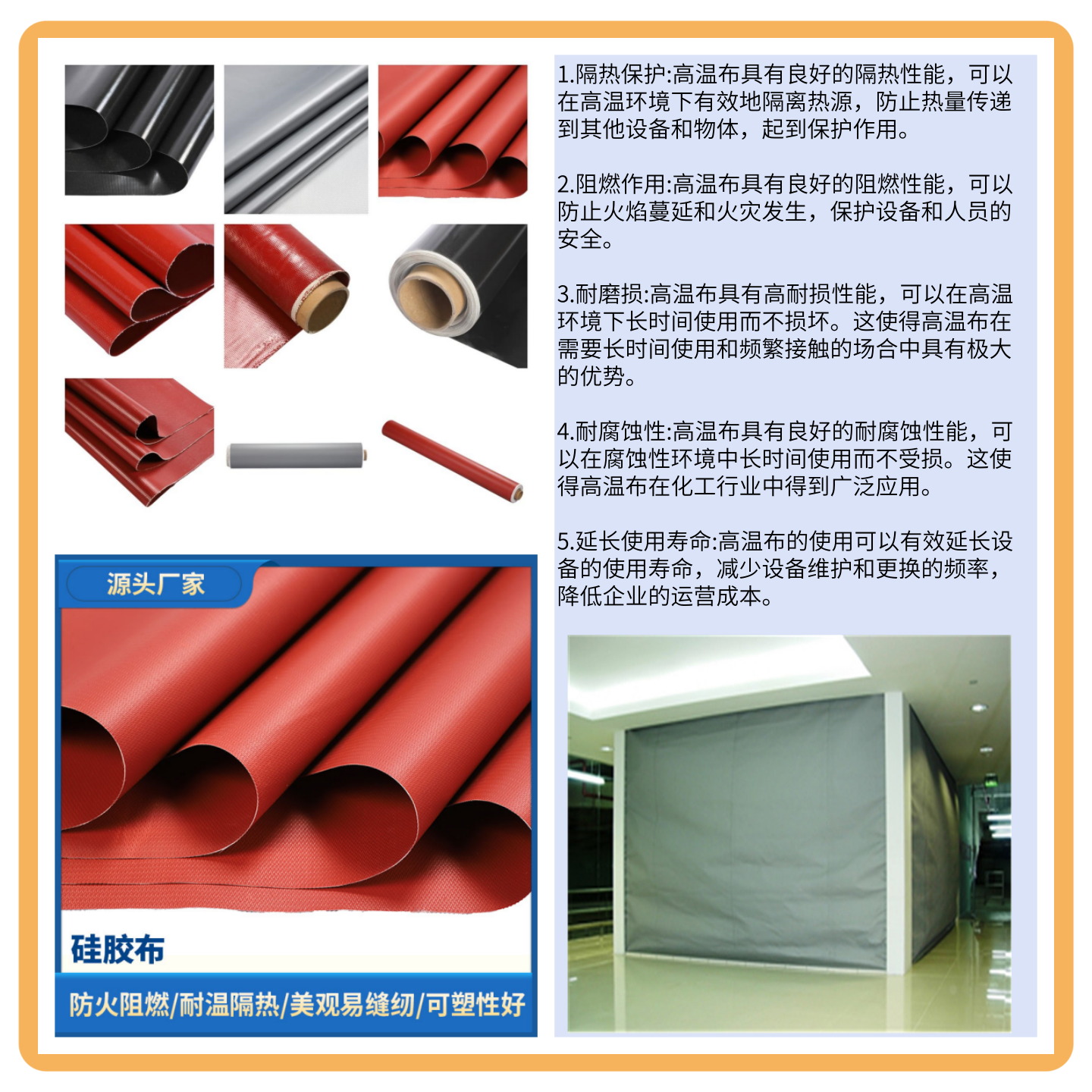 1.隔热保护:高温布具有良好的隔热性能,可以在高温环境下有效地隔离热源,防止热量传递到其他设备和物体,起到保护作用。2.阻燃作用:高温布具有良好的阻燃性能,可以防止火焰蔓延和火灾发生,保护设备和人员的安全。3.耐磨损:高温布具有高耐磨损性能,可以在高温环境下长时间使用而不损坏。这使得高温布在需要长时间使用和频繁接触的场合中具有极大的优势。4.耐腐蚀性:高温布具有良好的耐腐蚀性能,可以在腐蚀性环境中长时间使用而不受损。这使得高温布在化工行业中得到广泛应用。5.延长使用寿命:高温布的使用可以有效延长设备的使用寿命,减少设备维护和更换的频率,降低企业的运营成本。