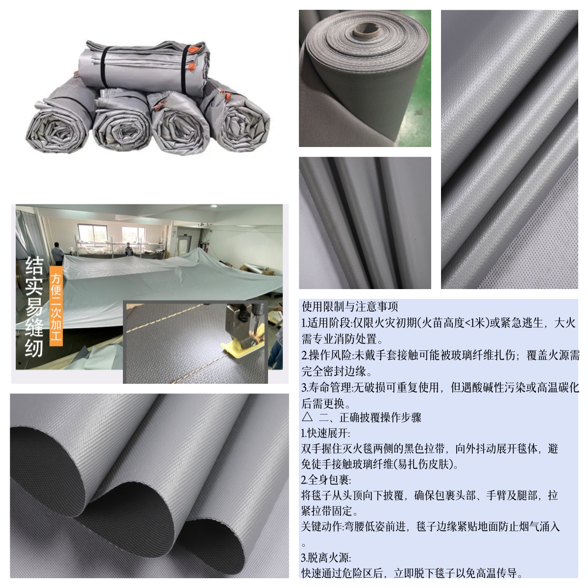 1.全身包惠:火灾时披覆全身(需完全覆盖皮肤),可短期抵御800°C-1000℃C高温及有毒烟气,争取逃生时间。